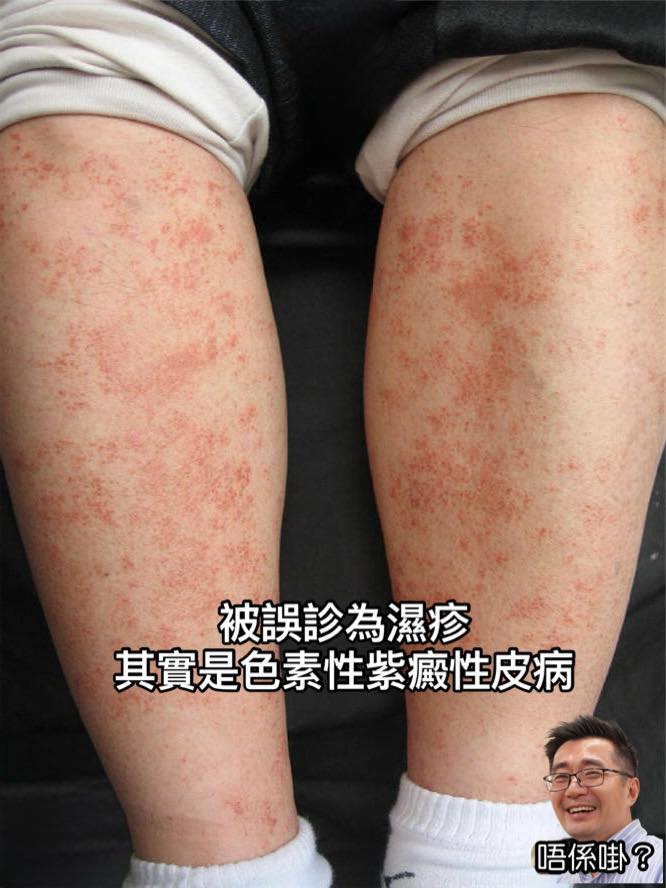 女病人被誤診是濕疹,其實她不痕不痛,臨床如果有紅色一大片的不明原因紅斑、紅疹,不一定是濕疹,濕疹99%痕,而仔細觀察與觸碰皮膚後,這位披唇是小血管炎,也就是色素性紫癜性皮病,輕微的不用治療,嚴重的可食中藥活血化瘀、退紅,減淡色素。