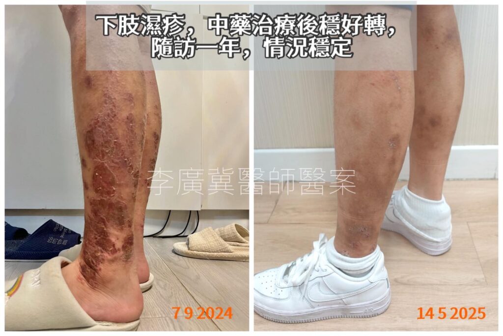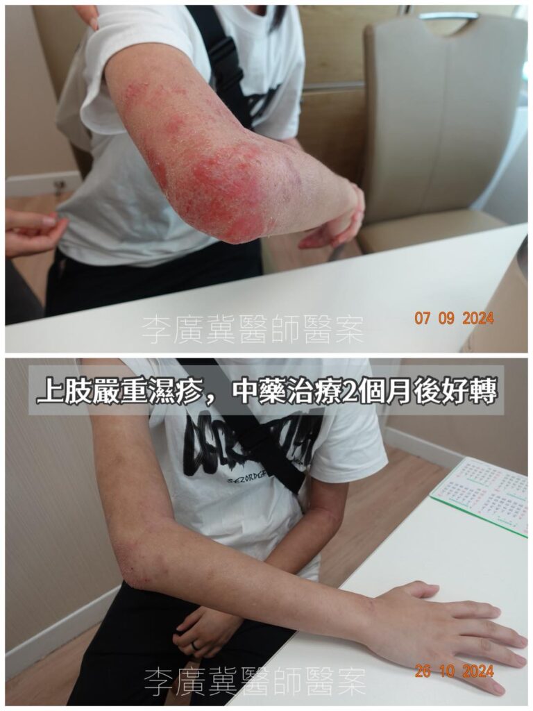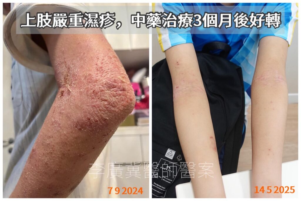 初中女披唇四肢嚴重濕疹, 幾乎全身都有濕疹,破損紅腫的情況都比較嚴重,使用類固醇控制,停用後又復發。2024年9月時病情最為嚴重,之後到診所找柴醫治療,大約兩個月,逐漸好轉。12月停止服食中藥,情況相對穩定,皮膚也好轉九成。最近又有一點轉季濕疹發作,但尚算輕微,需要再食中藥穩定病情,起碼無戒類的反彈,相對容易好轉。